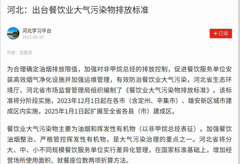 为合理确定油烟排放限值,加强对非甲烷总烃的排放控制,促进餐饮服务单位安装高效烟气净化设施并加强运维管理,有效防治餐饮业大气污染,91直播-国产视频-麻豆传媒视频 、河北省市场监督管理局组织编制了《餐饮业大气污染物排放标准》。该标准将分阶段实施,2023年12月1日起在各市(含定州、辛集市)、雄安新区城市建成区内实施,2025年1月1日起扩展至全省各县(市)建成区。