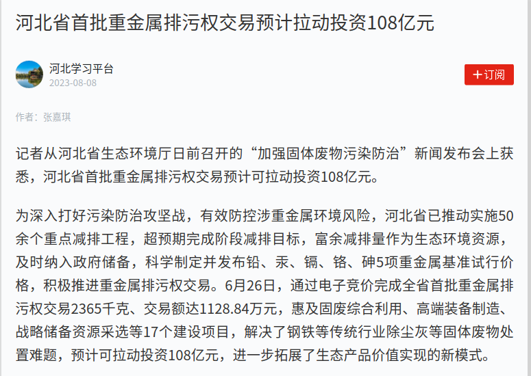 为深入打好污染防治攻坚战,有效防控涉重金属环境风险,河北省已推动实施50余个重点减排工程,超预期完成阶段减排目标,富余减排量作为91直播资源,及时纳入政府储备,科学制定并发布铅、汞、镉、铬、砷5项重金属基准试行价格,积极推进重金属排污权交易。6月26日,通过电子竞价完成全省首批重金属排污权交易2365千克、交易额达1128.84万元,惠及固废综合利用、高端装备制造、战略储备资源采选等17个建设项目,解决了钢铁等传统行业除尘灰等固体废物处置难题,预计可拉动投资108亿元,进一步拓展了生态产品价值实现的新模式。