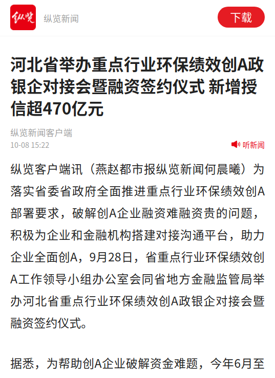 纵览新闻客户端:河北省举办重点行业环保绩效创A政银企对接会暨融资签约仪式 新增授信超470亿元