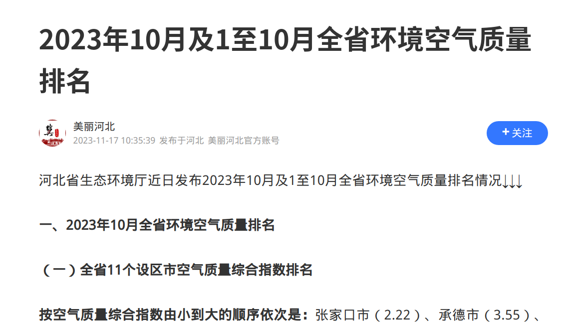 近日发布2023年10月及1至10月全省环境空气质量排名情况↓↓↓