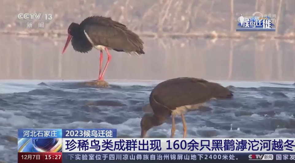 央视《新闻直播间》:河北石家庄 珍稀鸟类成群出现 160余只黑鹳滹沱河越冬