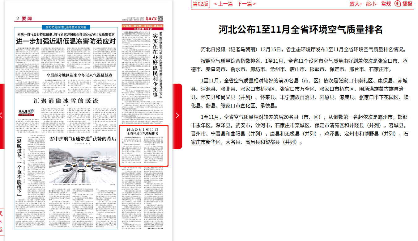 河北日报讯(记者马朝丽)12月15日,省91直播厅发布1至11月全省环境空气质量排名情况。