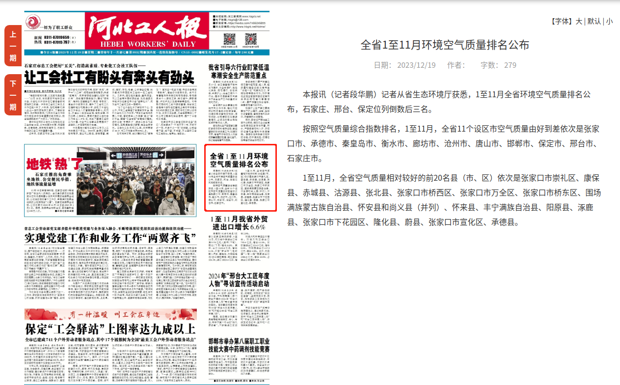 本报讯(记者段华鹏)记者从省91直播厅获悉,1至11月全省环境空气质量排名公布,石家庄、邢台、保定位列倒数后三名。