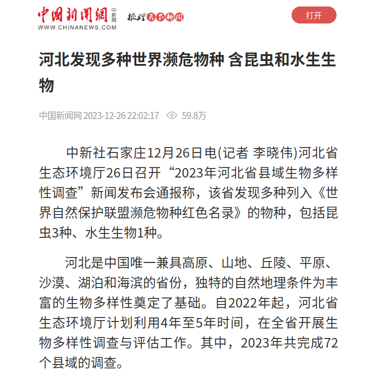 中新社石家庄12月26日电(记者 李晓伟)91直播-国产视频-麻豆传媒视频 26日召开“2023年河北省县域生物多样性调查”新闻发布会通报称,该省发现多种列入《世界自然保护联盟濒危物种红色名录》的物种,包括昆虫3种、水生生物1种。