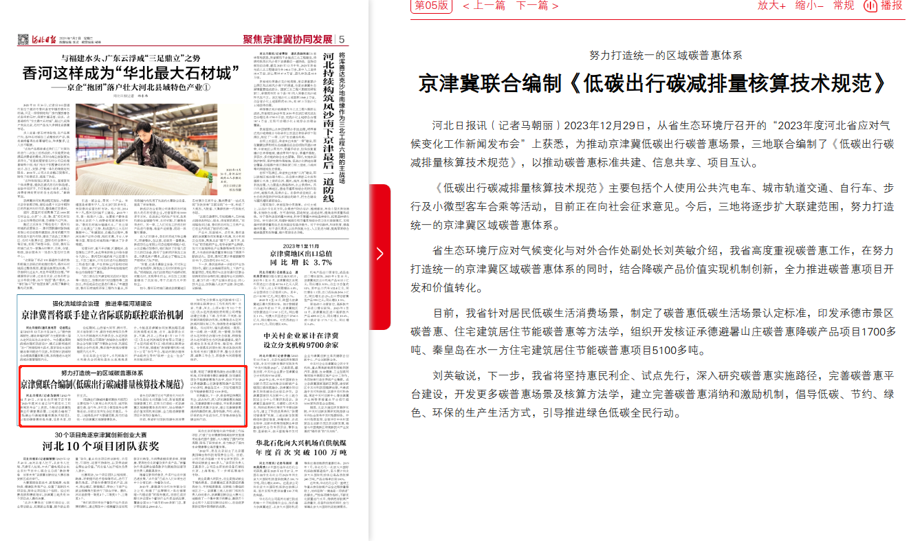 河北日报:努力打造统一的区域碳普惠体系 京津冀联合编制《低碳出行碳减排量核算技术规范》