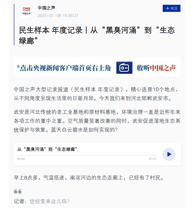 武安是河北传统的老工业基地和原材料基地,环境治理一直是近些年来各项工作的重中之重。空气质量显著改善的同时,武安促进湿地生态系统保护与恢复。蓝天白云碧水是如何实现的