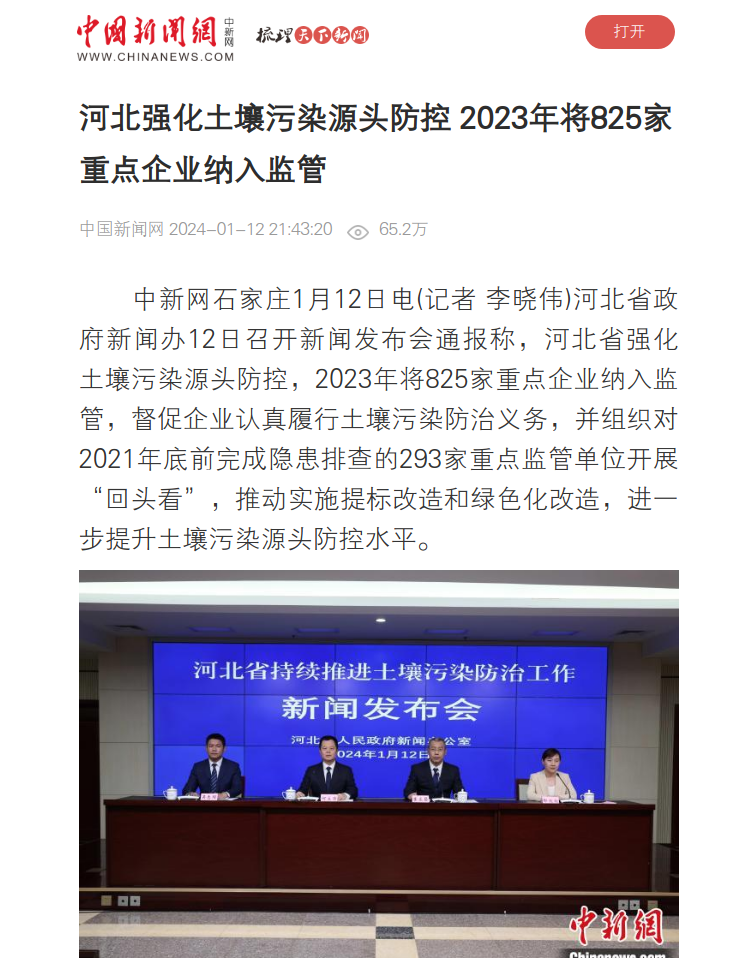 中新网石家庄1月12日电(记者 李晓伟)河北省政府新闻办12日召开新闻发布会通报称,河北省强化土壤污染源头防控,2023年将825家重点企业纳入监管,督促企业认真履行土壤污染防治义务,并组织对2021年底前完成隐患排查的293家重点监管单位开展“回头看”,推动实施提标改造和绿色化改造,进一步提升土壤污染源头防控水平。