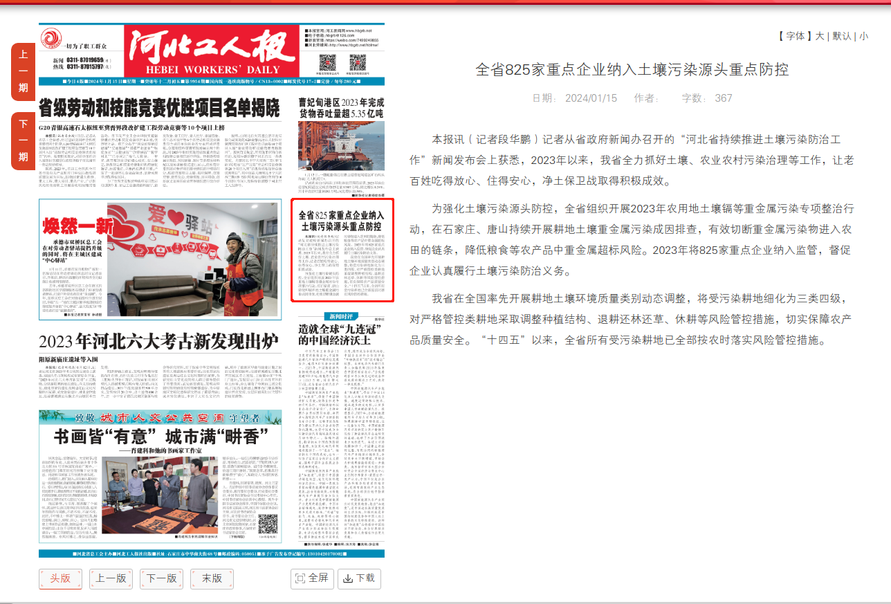 河北工人报:全省825家重点企业纳入土壤污染源头重点防控