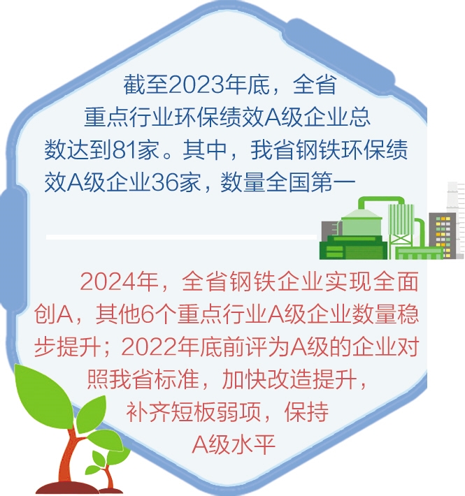 有力有序推进环保绩效创A,我省提出,2024年,全省钢铁企业实现全面创A,其他6个重点行业A级企业数量稳步提升;2022年底前评为A级的企业对照我省标准,加快改造提升,补齐短板弱项,保持A级水平。