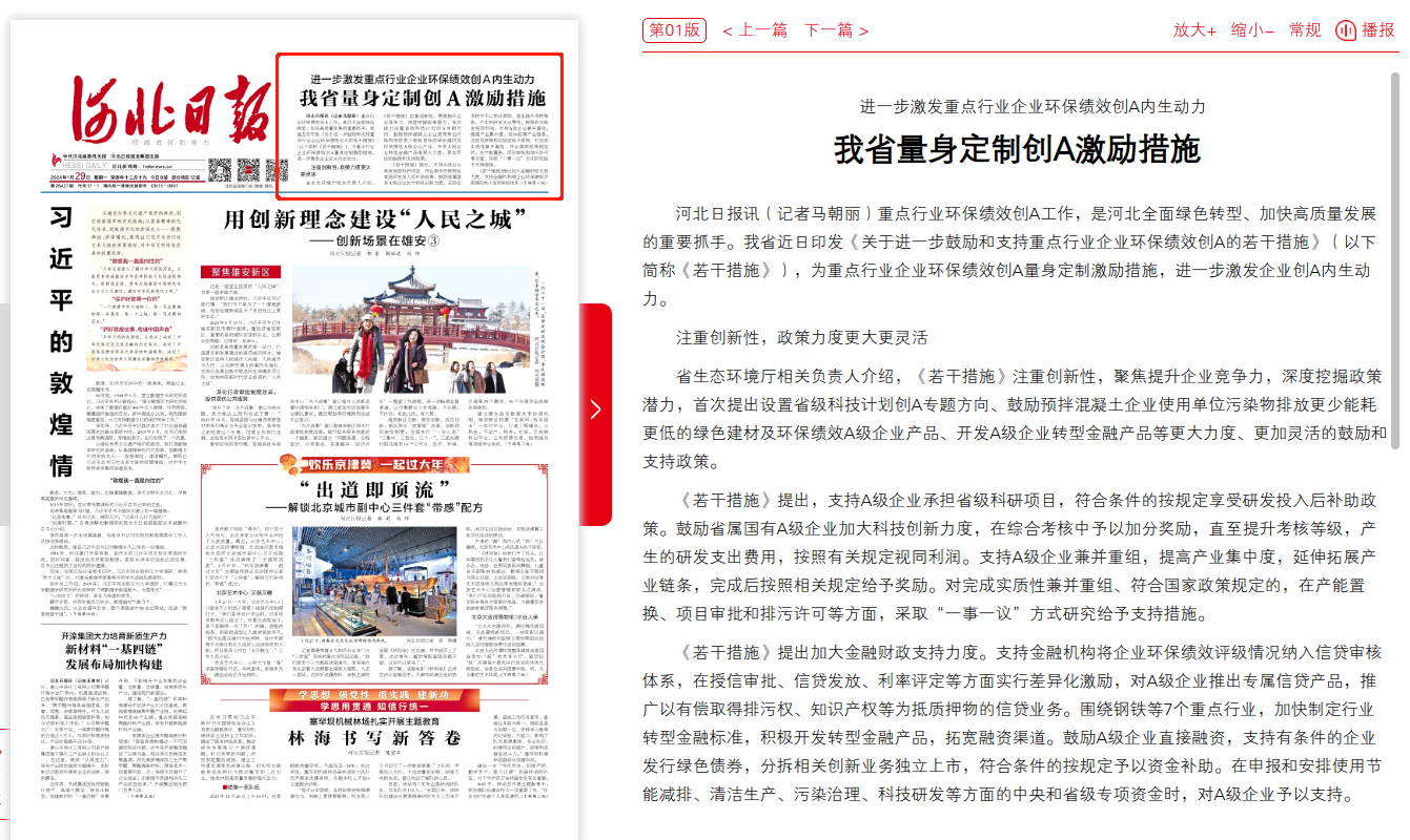 河北日报:进一步激发重点行业企业环保绩效创A内生动力 我省量身定制创A激励措施