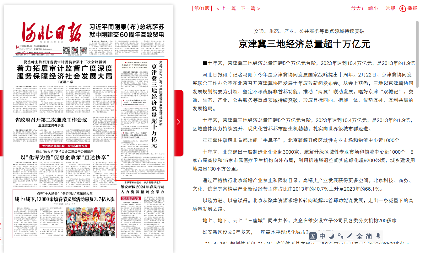 河北日报:交通、生态、产业、公共服务等重点领域持续突破 京津冀三地经济总量超十万亿元