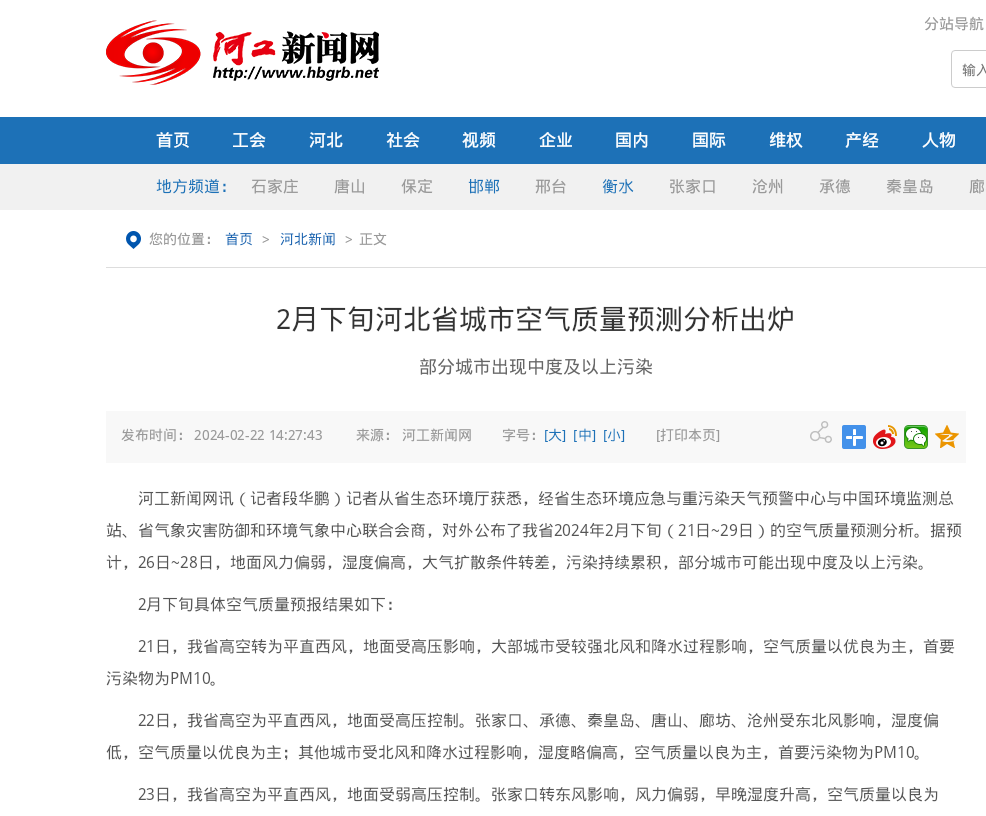 河工新闻网:2月下旬河北省城市空气质量预测分析出炉 部分城市出现中度及以上污染