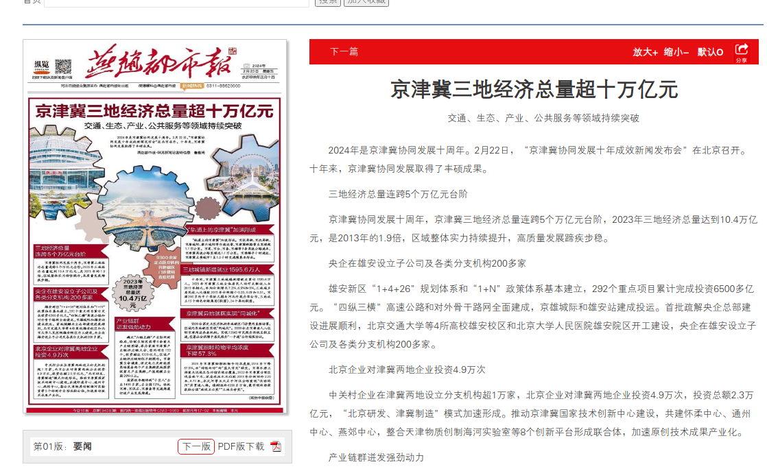 燕赵都市报:京津冀三地经济总量超十万亿元 交通、生态、产业、公共服务等领域持续突破