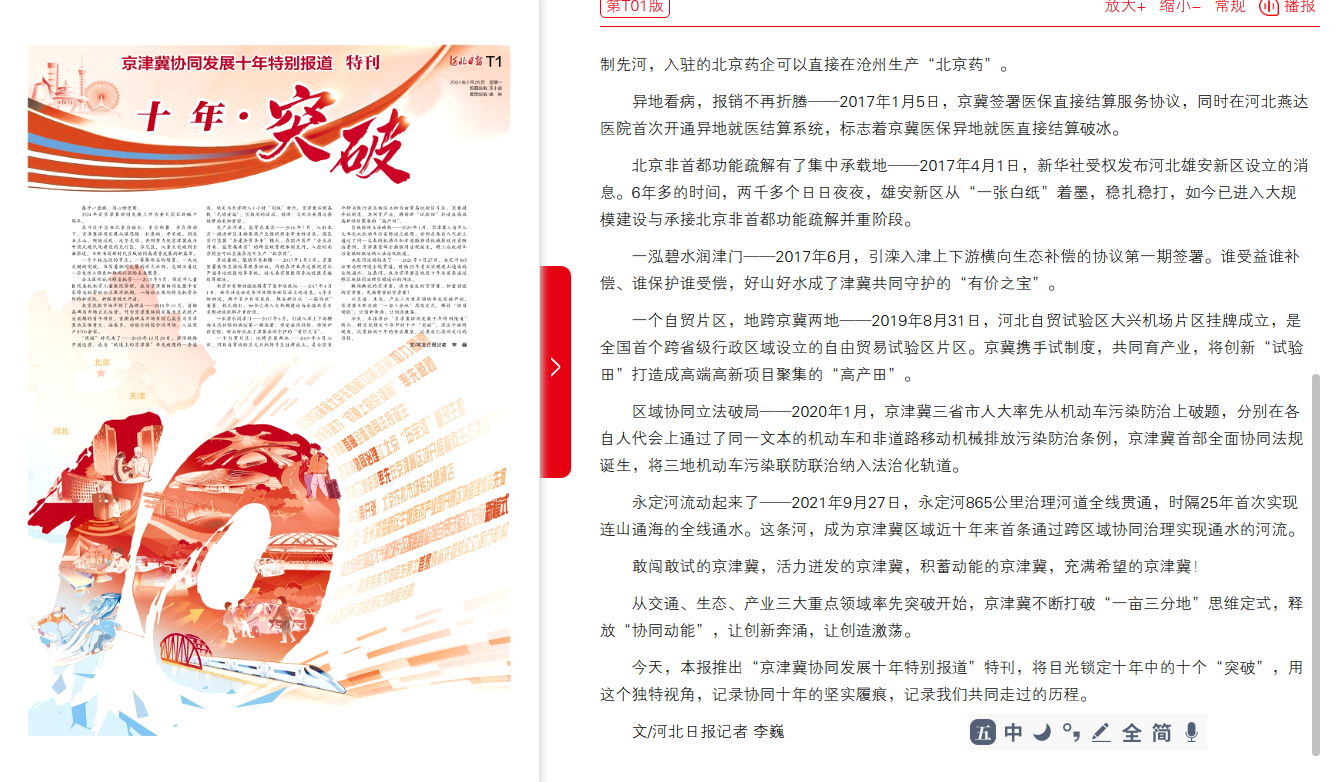 今天,本报推出“京津冀协同发展十年特别报道”特刊,将目光锁定十年中的十个“突破”,用这个独特视角,记录协同十年的坚实履痕,记录我们共同走过的历程。