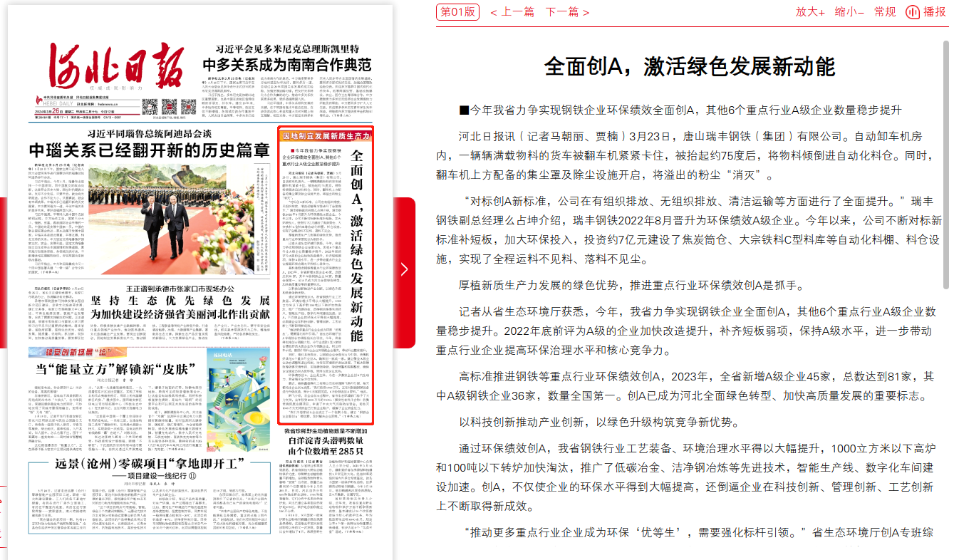 高标准推进钢铁等重点行业环保绩效创A,2023年,全省新增A级企业45家,总数达到81家,其中A级钢铁企业36家,数量全国第一。创A已成为河北全面绿色转型、加快高质量发展的重要标志。