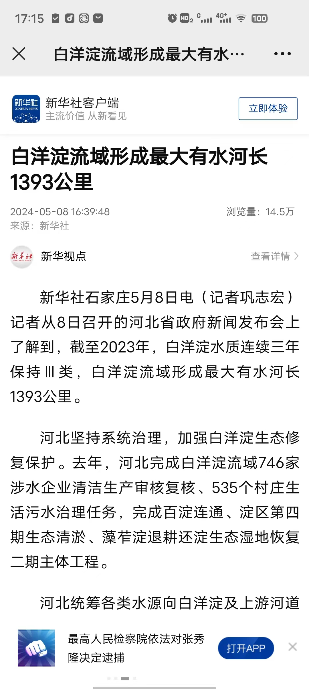 新华社石家庄5月8日电(记者巩志宏)记者从8日召开的河北省政府新闻发布会上了解到,截至2023年,白洋淀水质连续三年保持Ⅲ类,白洋淀流域形成最大有水河长1393公里。