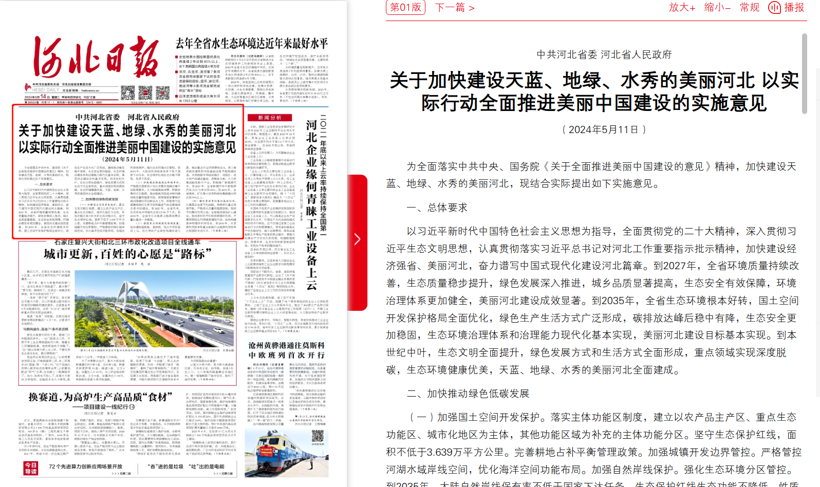 河北日报:中共河北省委 河北省人民政府 关于加快建设天蓝、地绿、水秀的美丽河北 以实际行动全面推进美丽中国建设的实施意见