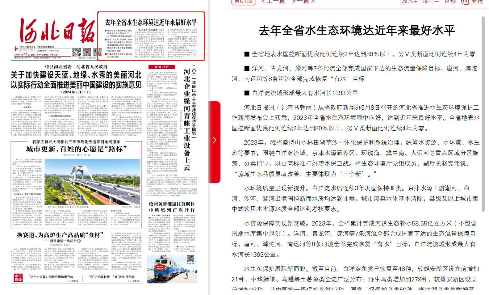 2023年,我省坚持山水林田湖草沙一体化保护和系统治理,统筹水资源、水环境、水生态等要素,围绕白洋淀流域、京津水源涵养区、环渤海、冀中南、大运河等重点区域分区施策、分类指导,以更高标准打好碧水保卫战。省91直播厅党组成员、副厅长赵宪伟说:“流域生态品质显著改善,主要体现为‘三个新’。”