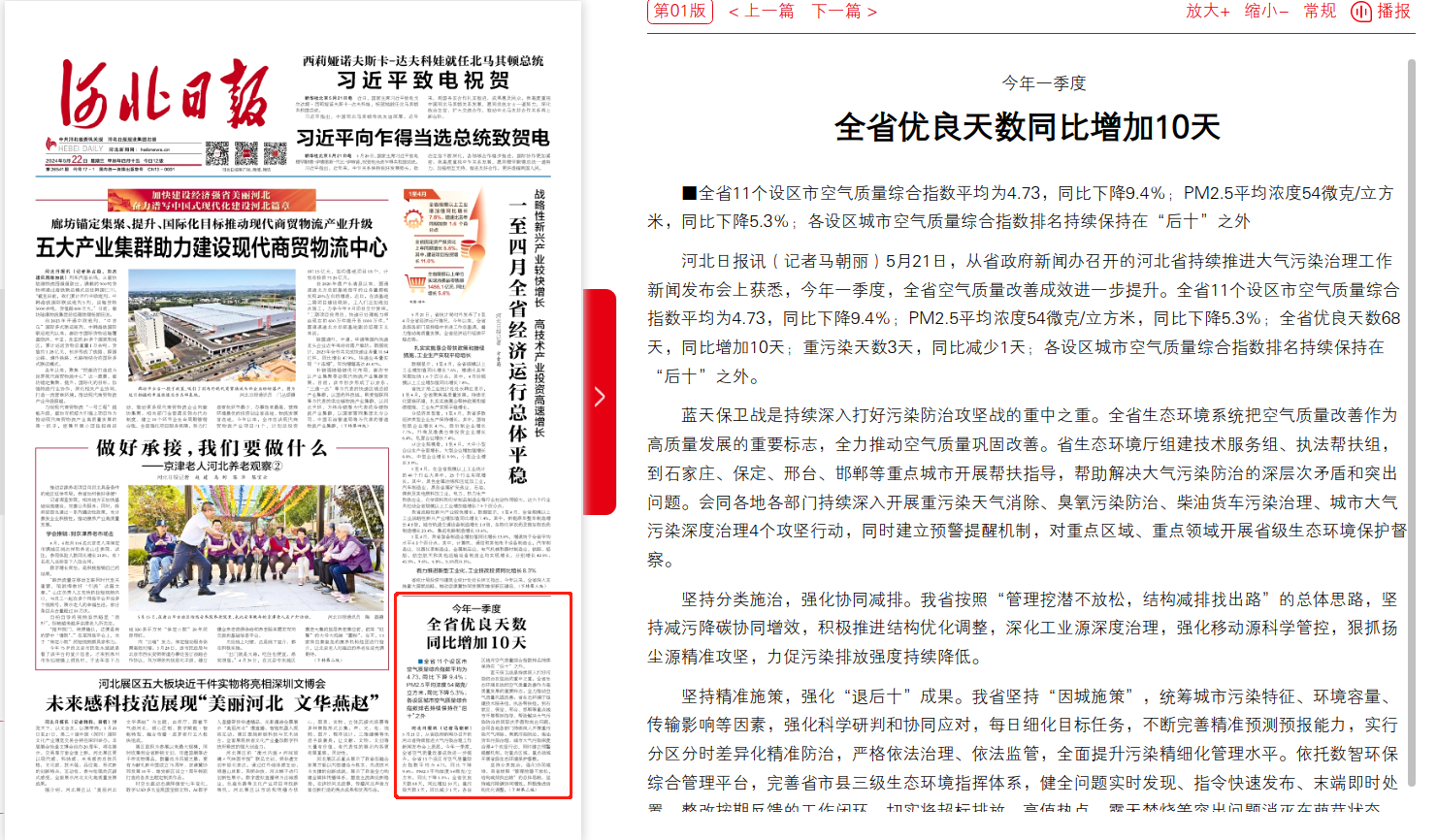 河北日报讯(记者马朝丽)5月21日,从省政府新闻办召开的河北省持续推进大气污染治理工作新闻发布会上获悉,今年一季度,全省空气质量改善成效进一步提升。全省11个设区市空气质量综合指数平均为4.73,同比下降9.4%;PM2.5平均浓度54微克/立方米,同比下降5.3%;全省优良天数68天,同比增加10天;重污染天数3天,同比减少1天;各设区城市空气质量综合指数排名持续保持在“后十”之外。