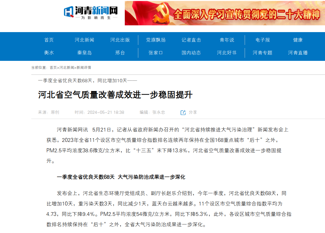 河青新闻网讯 5月21日,记者从省政府新闻办召开的“河北省持续推进大气污染治理”新闻发布会上获悉,2023年全省11个设区市空气质量综合指数排名连续两年保持在全国168重点城市“后十”之外,PM2.5平均浓度38.6微克/立方米,比“十三五”末下降13.8%,河北省空气质量改善成效进一步稳固提升。