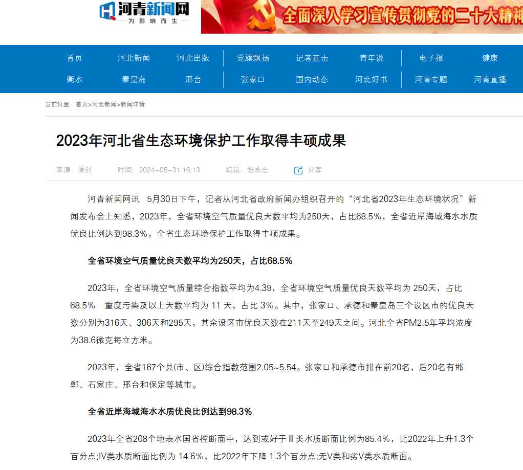 河青新闻网讯 5月30日下午,记者从河北省政府新闻办组织召开的“河北省2023年91直播状况”新闻发布会上知悉,2023年,全省环境空气质量优良天数平均为250天,占比68.5%,全省近岸海域海水水质优良比例达到98.3%,全省91直播保护工作取得丰硕成果。