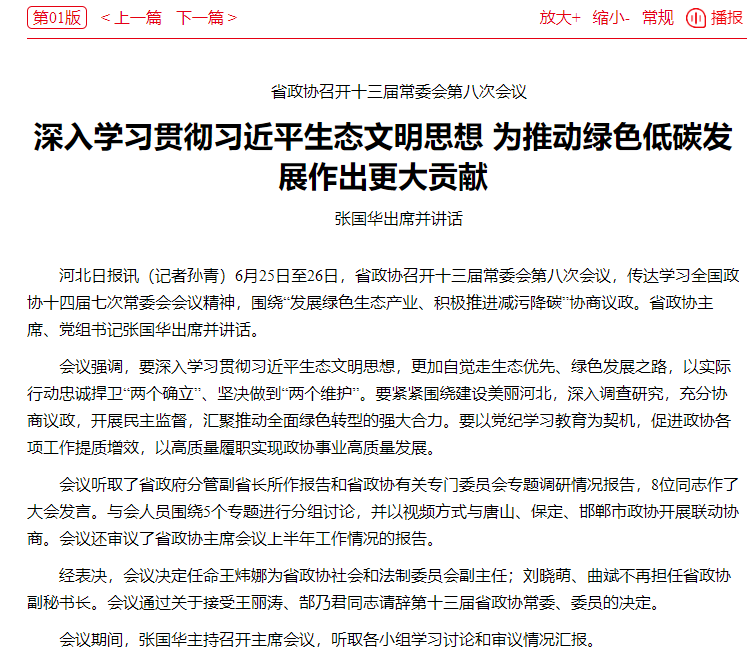 河北日报:省政协召开十三届常委会第八次会议 深入学习贯彻习近平生态文明思想 为推动绿色低碳发展作出更大贡献 张国华出席并讲话