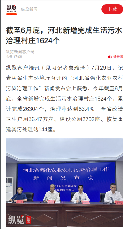 纵览新闻客户端:截至6月底,河北新增完成生活污水治理村庄1624个