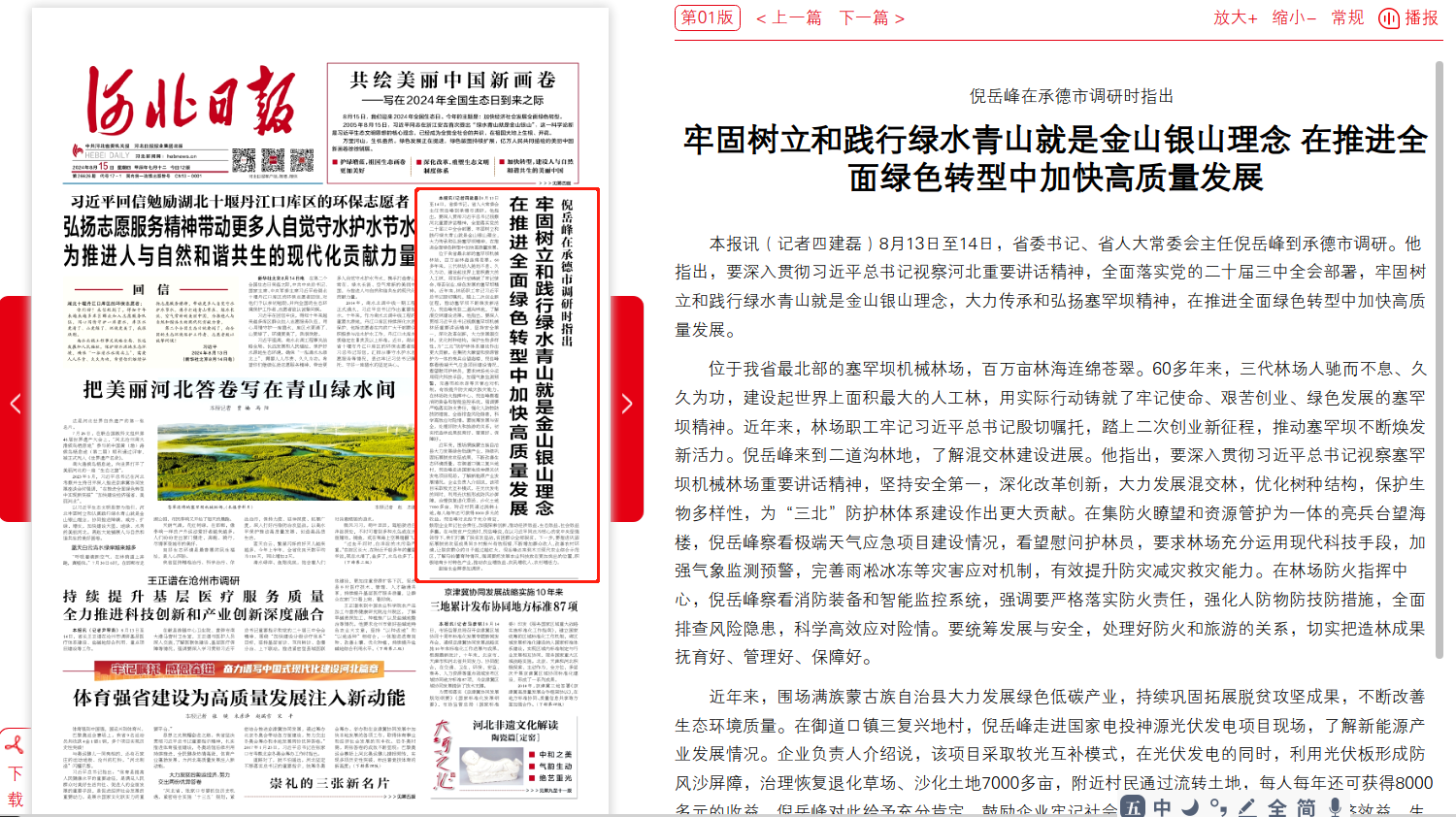河北日报:牢固树立和践行绿水青山就是金山银山理念 在推进全面绿色转型中加快高质量发展