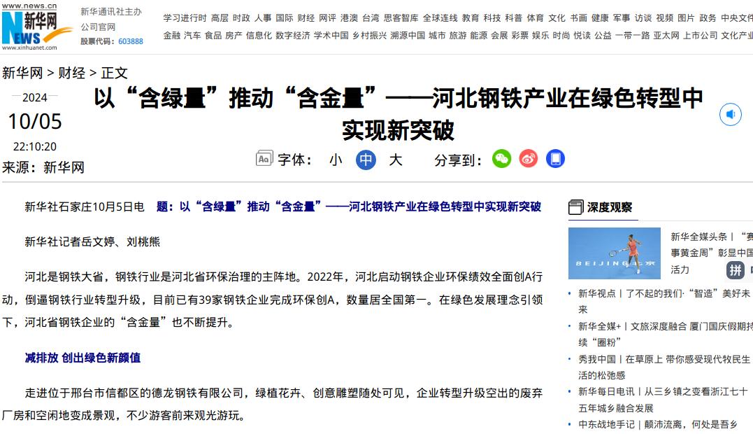 新华网:以“含绿量”推动“含金量”——河北钢铁产业在绿色转型中实现新突破
