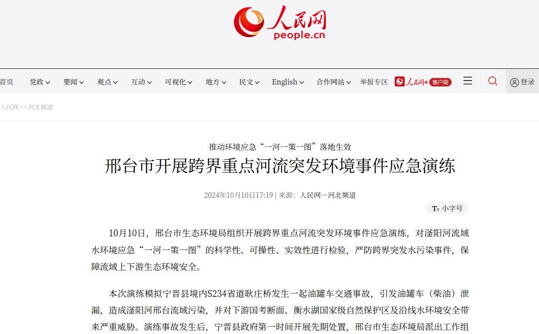 人民网:推动环境应急“一河一策一图”落地生效 邢台市开展跨界重点河流突发环境事件应急演练