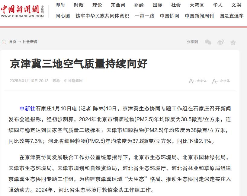中新社石家庄1月10日电 (记者 陈林)10日,京津冀生态协同专题工作组在石家庄召开新闻发布会通报称,经初步测算,2024年北京市细颗粒物(PM2.5)年均浓度为30.5微克/立方米,连续四年稳定达到国家空气质量二级标准;天津市细颗粒物(PM2.5)年均浓度为38微克/立方米,同比改善7.3%;河北省细颗粒物(PM2.5)年均浓度为37.8微克/立方米,同比下降2.1%。
