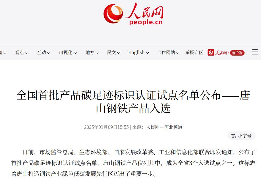 人民网:全国首批产品碳足迹标识认证试点名单公布——唐山钢铁产品入选
