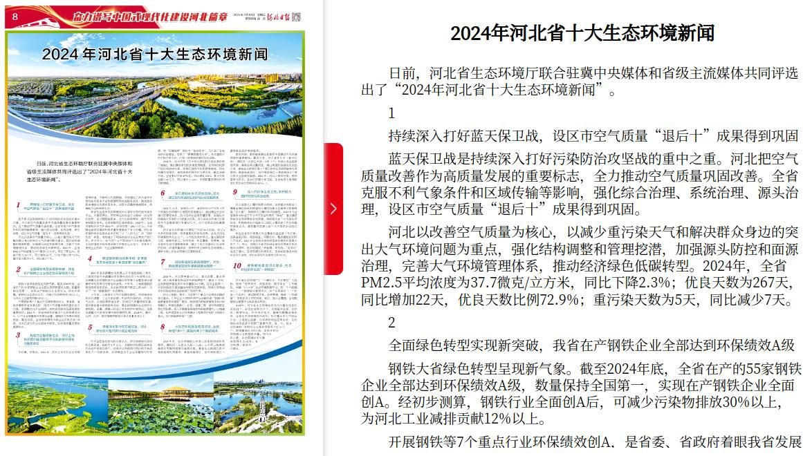 钢铁大省绿色转型呈现新气象。截至2024年底,全省在产的55家钢铁企业全部达到环保绩效A级,数量保持全国第一,实现在产钢铁企业全面创A。经初步测算,钢铁行业全面创A后,可减少污染物排放30%以上,为河北工业减排贡献12%以上。