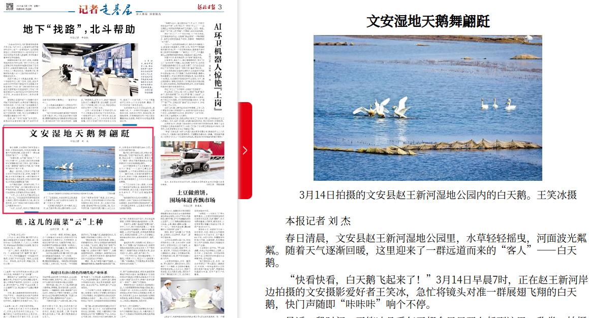 “水好,生态好,来的白天鹅自然就多了。”谷国通说,文安是候鸟迁徙通道上的重要节点,他们以绿色生态底色“筑巢”,引来水鸟“安家”。