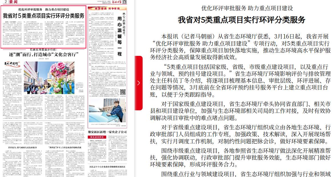 河北日报:优化环评审批服务 助力重点项目建设 我省对5类重点项目实行环评分类服务