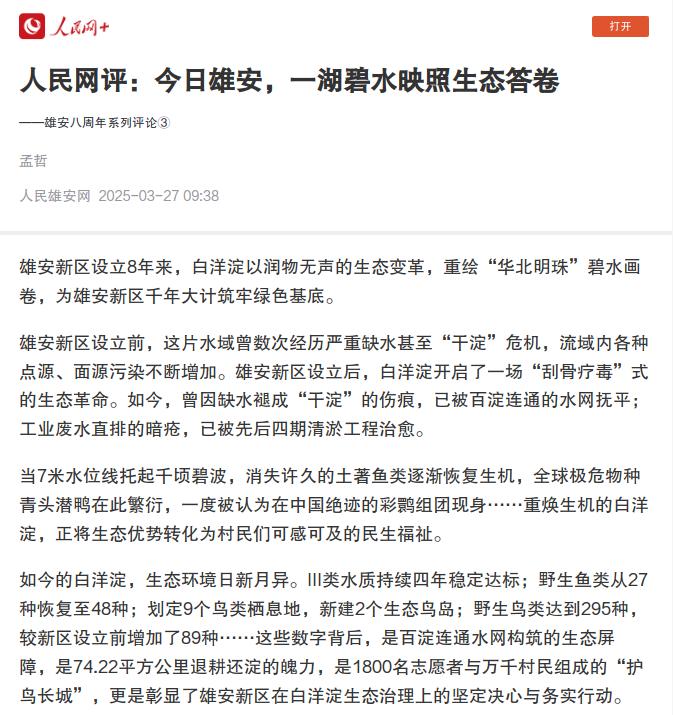 雄安新区以实践印证:生态保护与发展同频共振,既能让绿水青山转化为金山银山,更能成为滋养百姓的永续福祉。当“城淀相依、共生共融”的优美画卷徐徐展开,不仅树立了生态文明建设的鲜活样本,更兑现了千年大计落子之际的民生承诺。