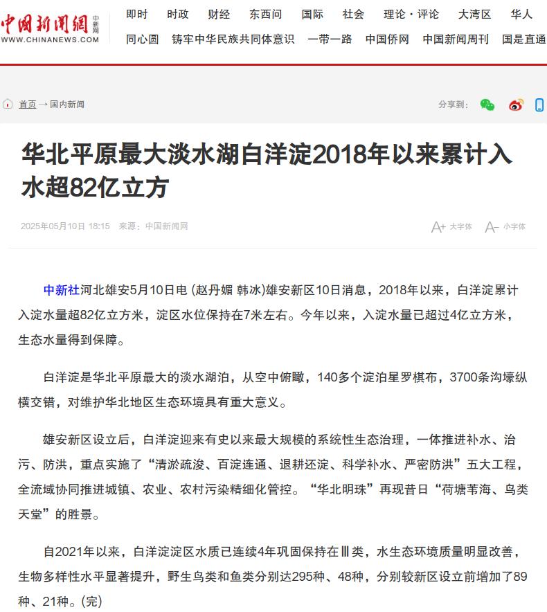 中新网:华北平原最大淡水湖白洋淀2018年以来累计入水超82亿立方