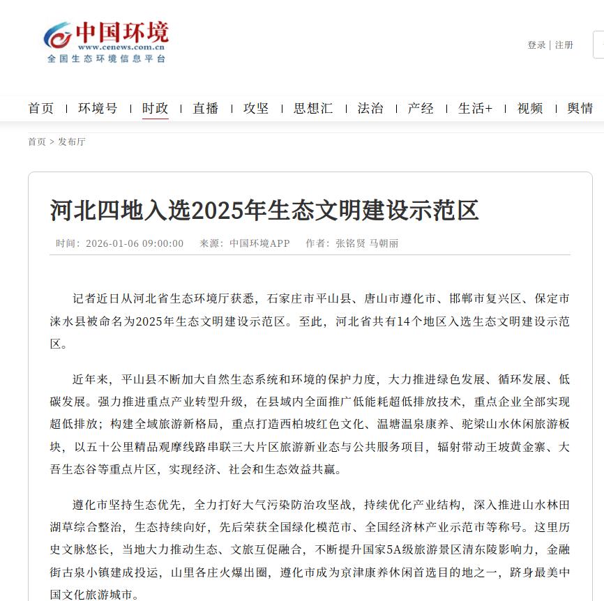中国环境客户端:河北四地入选2025年生态文明建设示范区