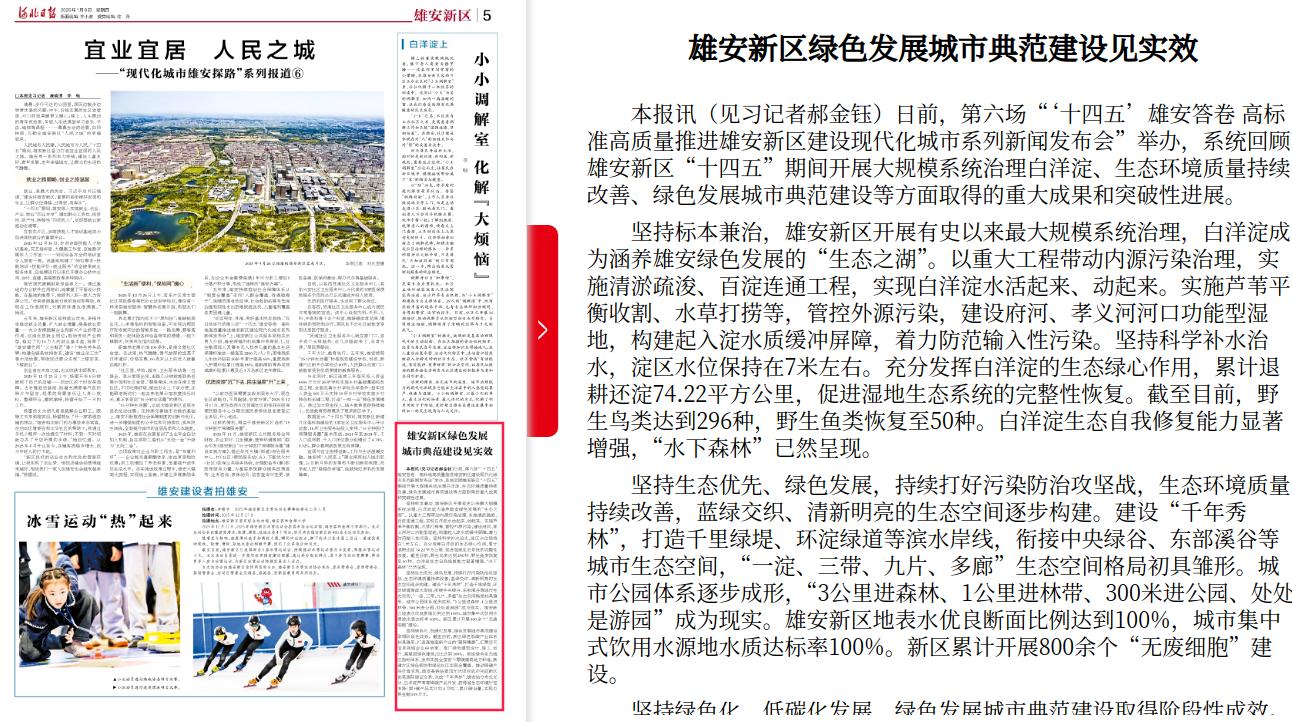 河北日报:雄安新区绿色发展城市典范建设见实效