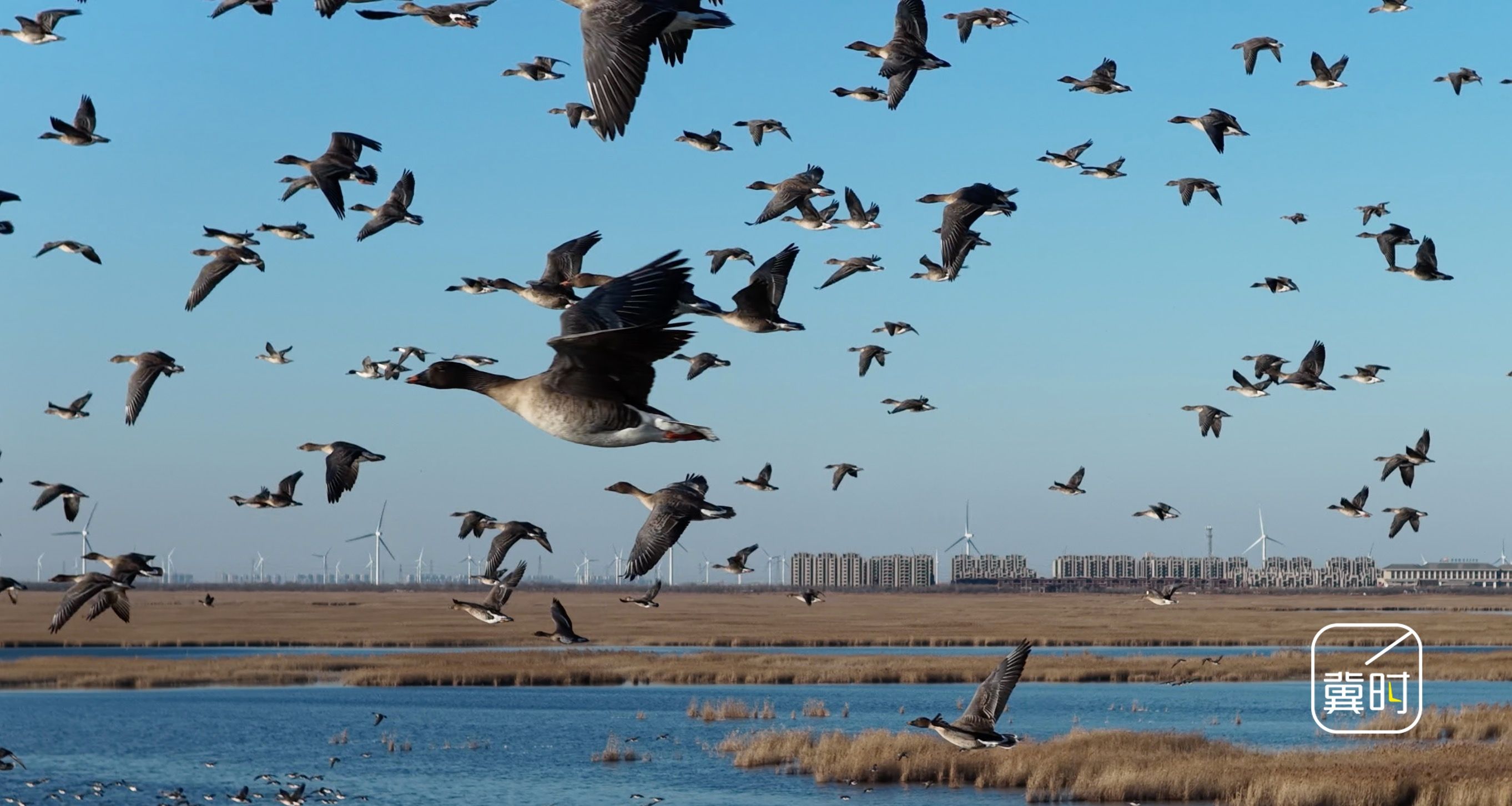 冀时新闻报道(河北台 任亚栋 张书伟 通讯员 张景兴 宋文峰)渤海湾畔寒意正浓,沧州南大港湿地却生机盎然。上万只豆雁大批飞抵,使这片湿地2025年迁徙候鸟总数突破12万只,刷新历史纪录。