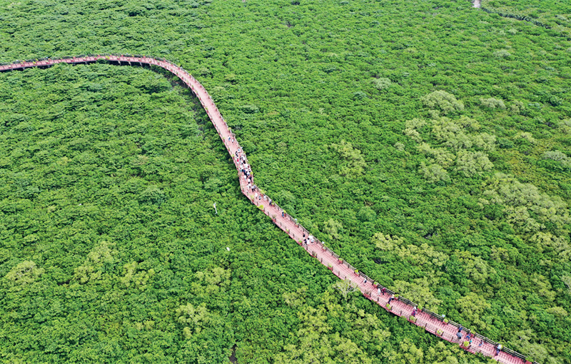 推动绿色发展,建设生态文明,重在建章立制。近年来,广西北仑河口国家级自然保护区所在的广西防城港市建立红树林精细“管、护、研”一体化工作机制,全面开展巡护管理、科研监测、宣传教育、社区共管、生态修复等各项工作,有效推动红树林生态系统质量全面提升。图为2024年8月24日拍摄的广西北仑河口国家级自然保护区的红树林。 新华社记者 陆波岸/摄