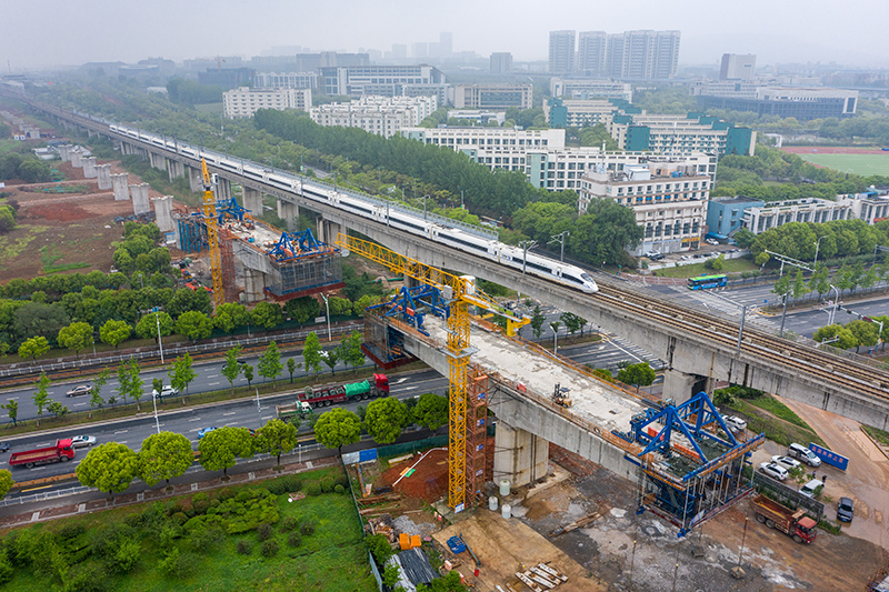 中铁四局四公司的工程人员在江苏南沿江城际铁路站前Ⅰ标工程跨天元东路连续梁施工点施工作业(2021年4月27日摄,无人机照片)。新华社记者 李博 摄
