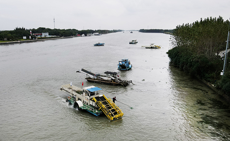 苏浙沪三地的保洁船在太浦河水域联合清理水面浮游植物(2020年10月15日摄,无人机照片)。当日,来自苏州市吴江区、上海市青浦区和嘉兴市嘉善县的三名河长在位于长三角生态绿色一体化发展示范区的苏浙沪交界水域太浦河流域附近开展联合巡河活动。新华社记者 方喆 摄