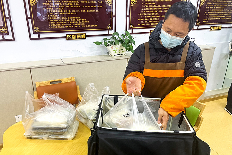 2022年11月3日,吉林省长春市朝阳区东田社区助老餐厅的工作人员准备为社区居民送餐。新华社记者 赵丹丹 摄