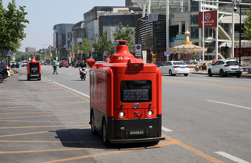 2021年5月18日,一辆自动行驶快递车在天津(西青)国家级车联网先导区内运送货物。新华社发