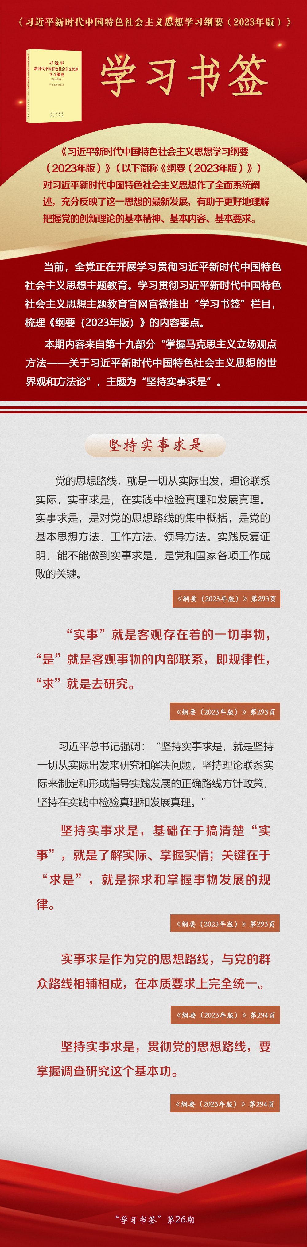 《习近平新时代中国特色社会主义思想学习纲要(2023年版)》 学习书签丨坚持实事求是 来源:人民网-中国共产党新闻网 时间:2024-01-12