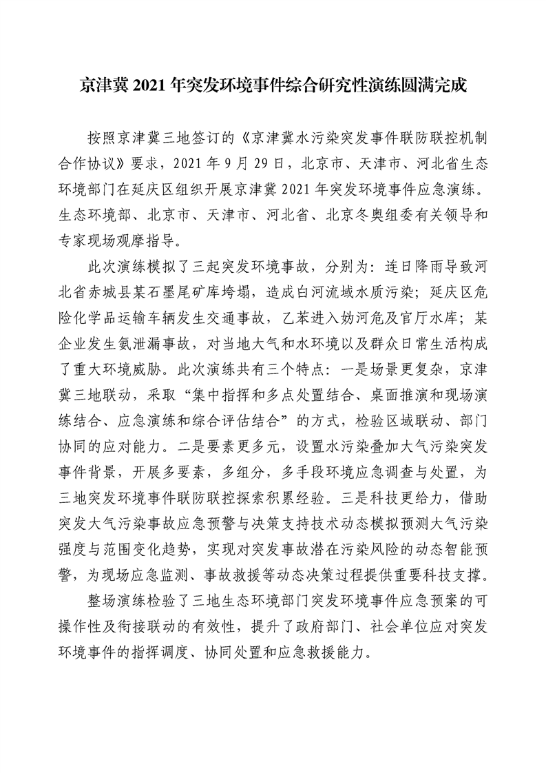 京津冀2021年突发环境事件综合研究性演练圆满完成