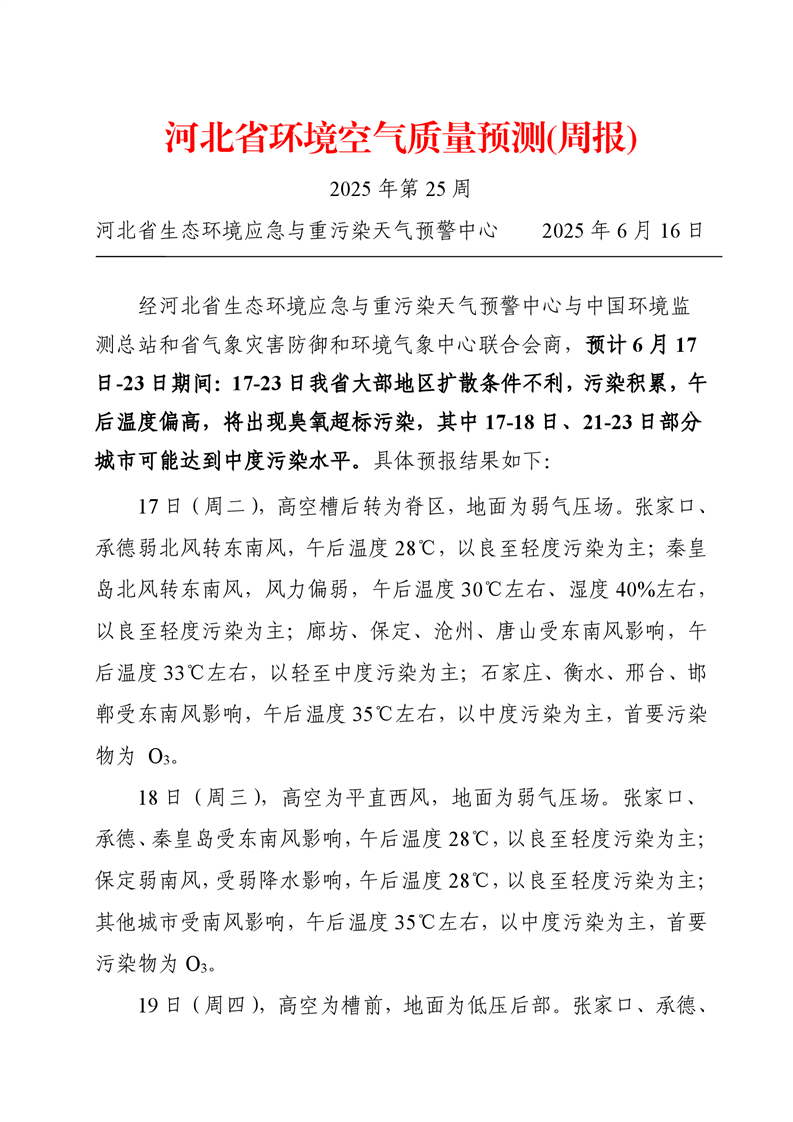 河北省空气质量预测报告(周报)2025年第25周